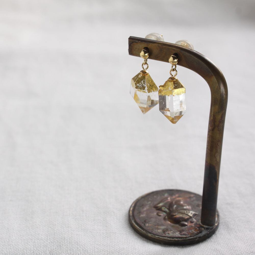 漆と金箔でアクセントを加えた大粒のハーキマーダイヤモンドが"木の実"のようにゆらゆらと揺れる存在感のあるピアスです。